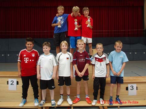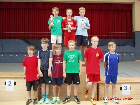Alle Sieger, Zweit- und Drittplatzierte mit dem Turnierorganistor Johannes Spille, Gerrit Geerds von der Tennisregion und Rainer Voigt als Gastgeber der Grundschule Lohne.
