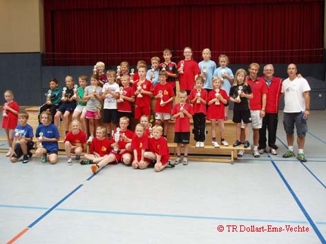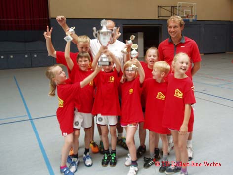 Die jeweiligen drei Ersten wurden mit Pokalen ausgezeichnet und entsprechend geehrt. Das Tennis nicht ein Einzelsport sondern ein Mannschaftssport ist, dass konnten die Kinder spätestens bei der Siegerehrung der Schule feststellen. Denn jedes Kind spielte auch Punkte für die Schule ein. Die meisten Punkte, wenn auch nur ganz knapp, konnten die Schüler / innen der Grundschule Lohne gewinnen. Sie freuten sich mit ihrem Sportlehrer Rainer Voigt über den Gewinn eines großen, tollen Wanderpokals für die Schule. Die Tennisregion stiftete den Pokal, damit dieser Wettbewerb auch in den nächsten Jahren fortgeführt werden kann.
